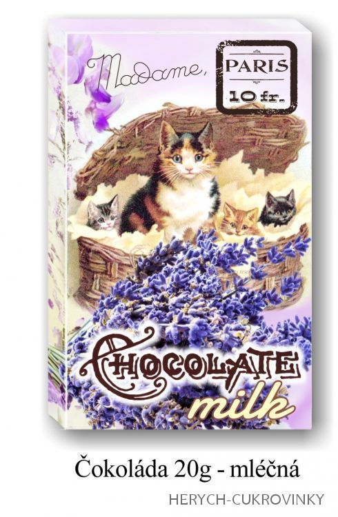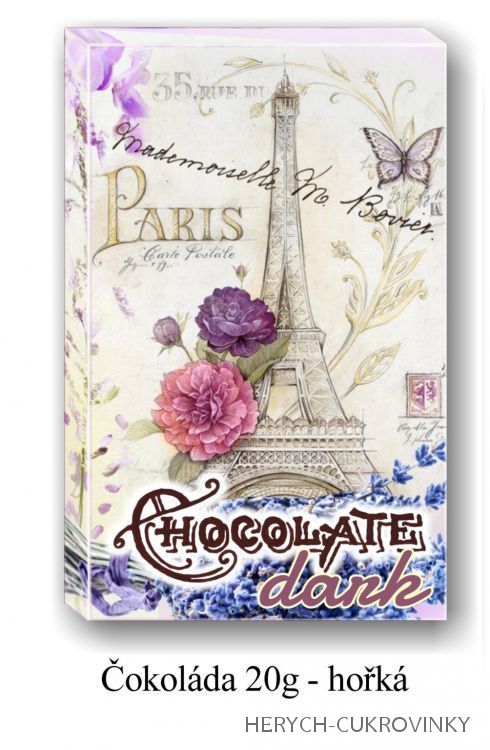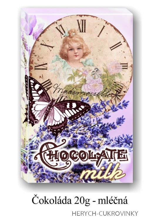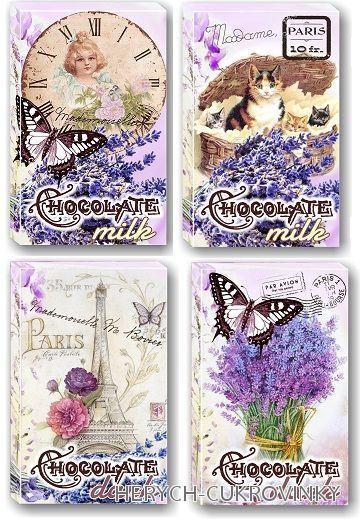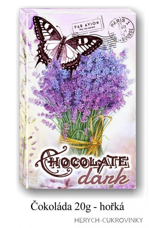16Ks balení-Belgické čokoládky z hořké čokolády 8ks (53% kakaa)a mléčné čokolády 8ks(32% kakaa). Motiv levandule.