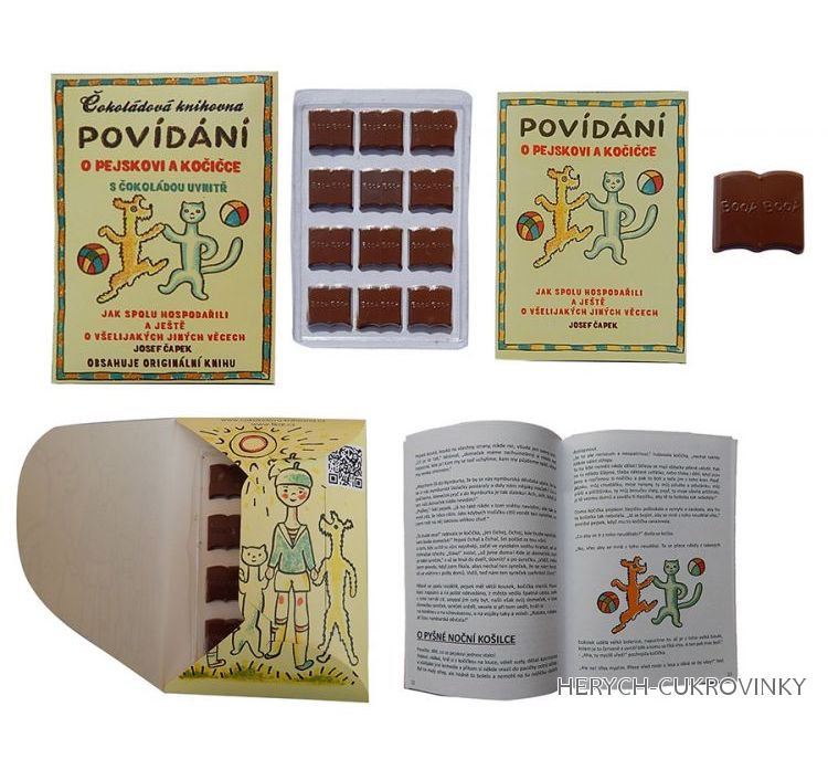 Dárková čokoládová kniha obsahujícíčokoládové knížečky z výborné belgické mléčné čokolády a navíc ještě knihu povídání o pejskovi a kočičce. Výborný dárek pro děti.